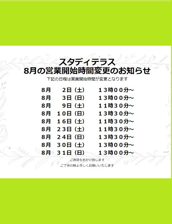 自習室スタディテラスの8月の営業時間変更のお知らせです。