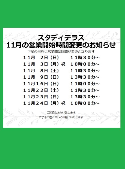 自習室スタディテラスの11月の営業時間変更のお知らせです。