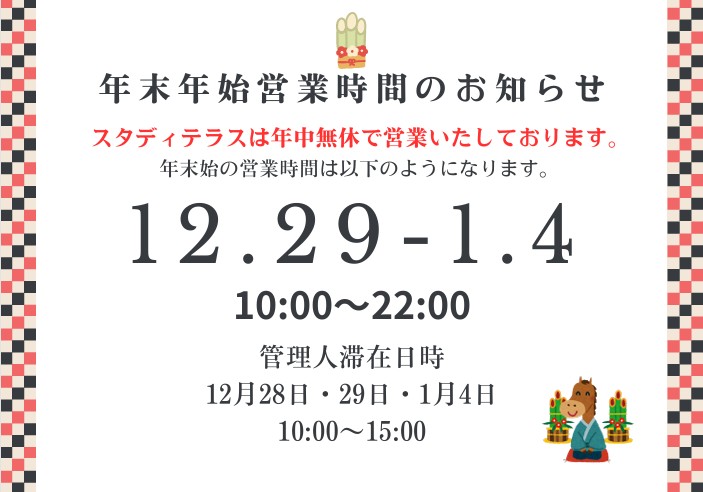年末年始も集中して頑張りたい皆さんを全力で応援します🔥スタディテラスは年末年始も年中無休です。